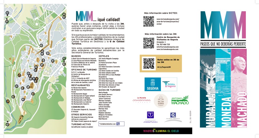Turismo de Segovia ha editado un folleto explicativo de las Rutas de las 3M, en el que además se incluyen los 45 profesionales y establecimientos de la ciudad que forman parte del SICTED (Sistema Integral de Calidad Turística en Destinos) y la Q de Calidad Turística.
