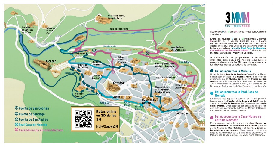 Los 3 recorridos parten del Acueducto y, pasando siempre por una de las 3M, descubren algunos de los rincones menos conocidos de la ciudad: del Acueducto a la Muralla; del Acueducto a la Casa-Museo de Antonio Machado; del Acueducto a la Real Casa de Moneda.