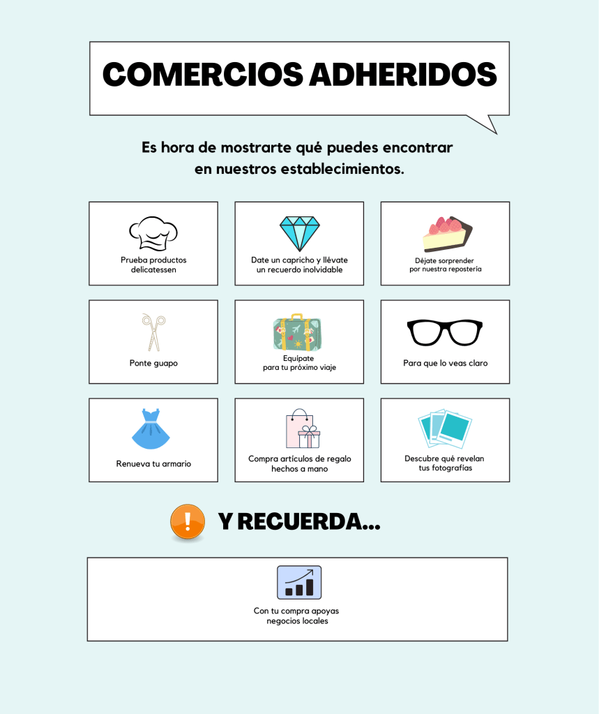 Son muchos los pequeños comercios del municipio adheridos a nuestra tarjeta, incorporados con el tiempo para ajustarse a las necesidades de los consumidores, siempre fieles al espíritu del comercio de proximidad.