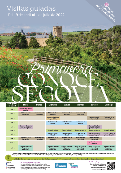 Bajo el lema Conoce Segovia Primavera se han organizado siete actividades especializadas para que segovianos y visitantes den comienzo a una primavera llena de propuestas culturales que les ayuden a conocer la ciudad. La programación da comienzo hoy martes, 19 de abril, y continuará hasta el 1 de julio.