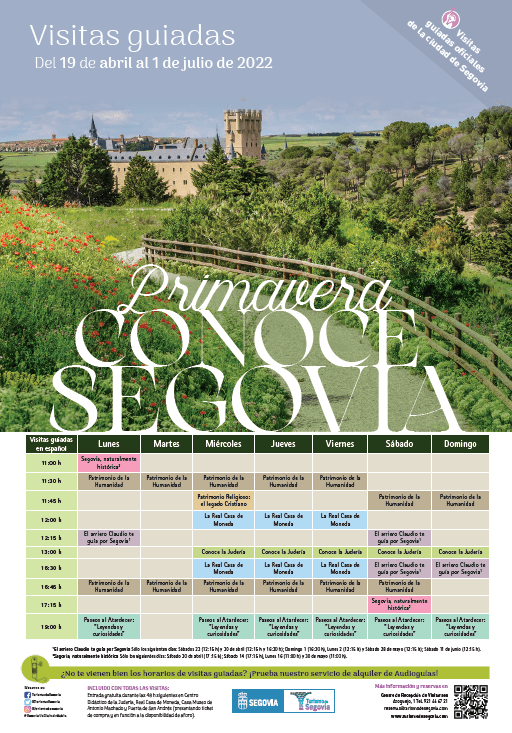 Todas las visitas pueden reservarse por teléfono, presencialmente en el Centro de Recepción de Visitantes o en www.turismodesegovia.com